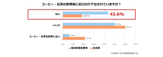 コーヒー・紅茶の飲用後にお口のケアをしているかどうか質問したところ、生活者のオーラルケア実施率は2割(18.5%)を下回りましたが、歯科医療従事者は4割以上(43.6%)となり、2倍以上の差が明らかになりました。