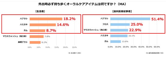 - 【必携オーラルケアアイテム】生活者はハブラシ(18.2%)、歯科医療従事者もハブラシ(51.4%)が最多。歯科医療従事者はフロス(25.0%)やマウスウォッシュ(22.9%)を携帯する人が多い