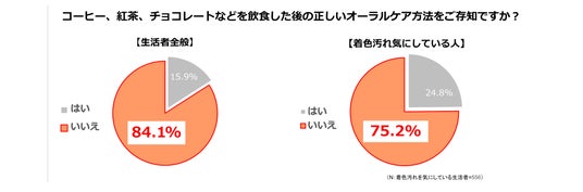 コーヒー、紅茶、チョコレート等の飲食により、着色汚れが蓄積することを紹介した上で、飲食後の正しいオーラルケア方法を知っているかどうか生活者に尋ねたところ、8割以上(84.1%)の人が「知らない」と回答。さらに、着色汚れを気にしている人の中でも、7割以上(75.2%)が飲食後の正しいオーラルケア方法を知らないと回答しました。