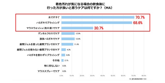 - 【おすすめ着色汚れケア】歯科医療従事者がおすすめする飲食後の着色汚れケアは1位が水ですすぐ(70.7%)、2位がハミガキでブラッシング(68.6%)、3位がマウスウォッシュ(洗口液)でケア(30.7%)の結果に