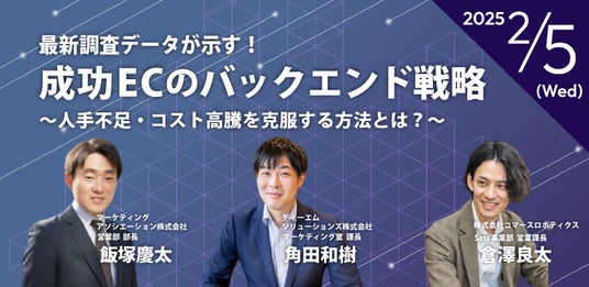 ECサイトの運営代行サービスを提供しているマーケティングアソシエーション株式会社(本社:東京都台東区 代表取締役:中園広和、以下当社)は、2025年2月5日(水)に、ウェブセミナー「最新調査データが示す!成功ECのバックエンド戦略~人手不足・コスト高騰を克服する方法~」を、株式会社コマースロボティクス、ディーエムソリューションズ株式会社と共催いたします。