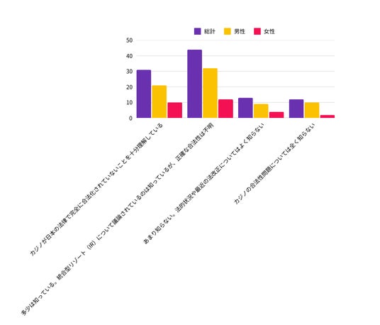 続いて、日本におけるカジノの法的状況に関する回答者の認知度を調査しました。その結果、44%の回答者が法的状況について「多少は知っている」と答えた一方で、物理的なカジノが合法化されていないことを完全に理解している回答者はわずか31%にとどまりました。このことは、政府によるカジノプラットフォームやその利用に関する法的状況の周知にまだ改善の余地があることを示しています。