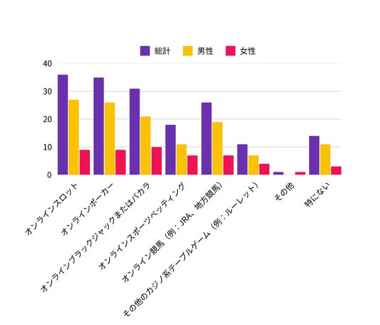 最も人気のあるオンラインカジノゲームはスロット(36%)とポーカー(35%)で、次いでブラックジャックやバカラ(31%)が続きました。興味深いことに、オンライン競馬(26%)はスポーツベッティング(18%)よりも人気があり、日本の競馬文化への親しみが反映されています。少数派(14%)は特に好むものはないと答え、このグループにはカジュアルなユーザーやオンラインカジノ初心者が含まれると考えられます。