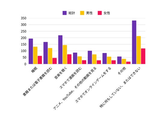 37.81%の回答者が通勤・通学中に「特に何もしていない、またはできない」と答えました。次いで、音楽を聴く人が24.94%、寝る人が22.1%、動画を観る人が11.5%、ゲームをする人が9.57%という結果でした。