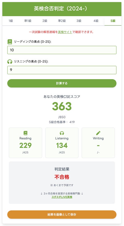 受験生が試験後に解答速報などをもとに自己採点し、正答数を入力。4級・5級はライティングが含まれないため(現行の試験形式において4級・5級ではライティング問題がない)、素点入力はリーディング、リスニングそれぞれの正答数のみが対象となります。