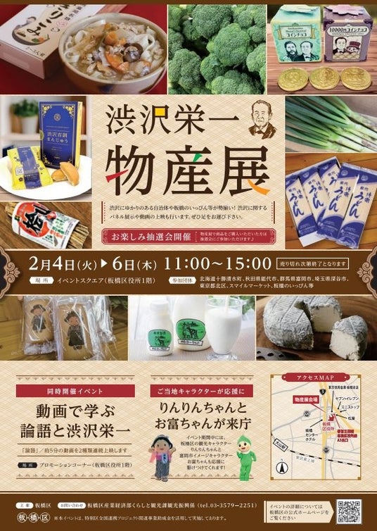 板橋区は、令和6年7月3日に新一万円札の肖像となった渋沢栄一にゆかりのある自治体や板橋のいっぴん等が集まり、産物を紹介・販売するイベントを開催いたします。自治体に加え、障がい者の方々が作る商品、こだわりの品を扱う地域のお店が集まる物産展となっており、地元の魅力や素敵な商品を、見て、買って、楽しめるイベントとなっています。