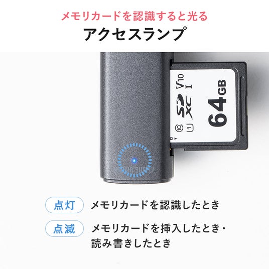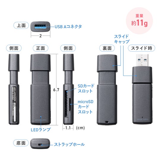 USB A カードリーダー スライド式 キャップ SDカード microSDカード USB5Gbps コンパクト ガンメタリック