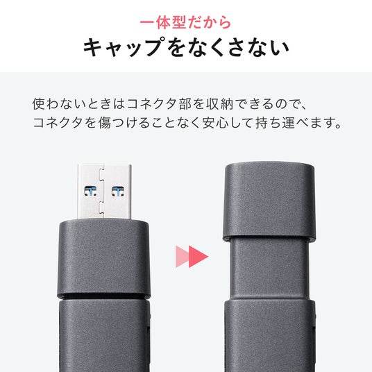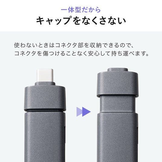 コネクタを守るスライド式キャップを採用。キャップ紛失のストレスを解消し、安心して持ち運べます。ガンメタリックの高級感あるデザインです。