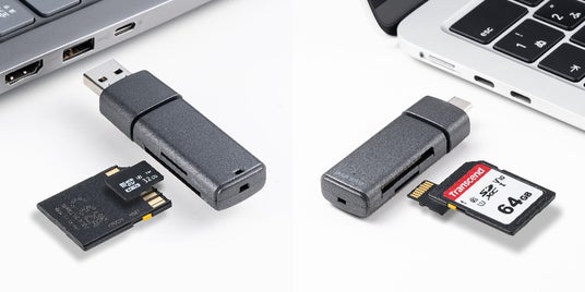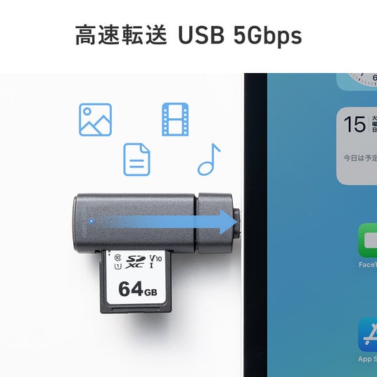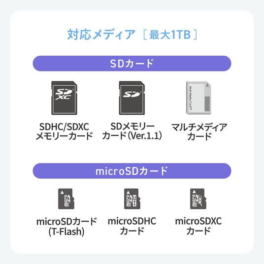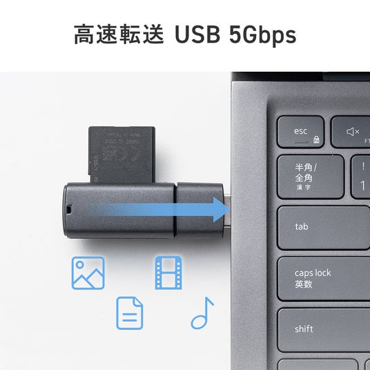 USB 5Gbps(USB3.2 Gen1)規格準拠の高速通信で、大容量データもスムーズに転送可能。最大1TBまでのSDカード、microSDカードに対応し、写真や動画ファイルの移動も快適です。