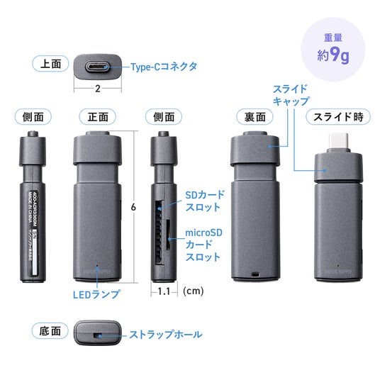 USB-C カードリーダー スライド式 キャップ SDカード microSDカード USB5Gbps Type-C コンパクト iPhone15/16 iPad 対応 ガンメタリック