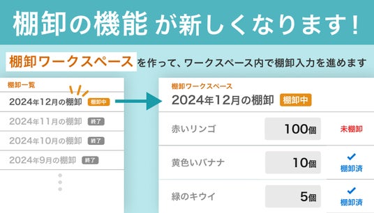 今回新設された「棚卸ワークスペース」は、「2024年12月の棚卸」「2025年3月の棚卸」というように、棚卸をするたびに「ワークスペース」(=作業部屋)を作成して、棚卸後の在庫数や、作業の進捗状況を誰でも簡単に入力・確認することができる専用ページです。