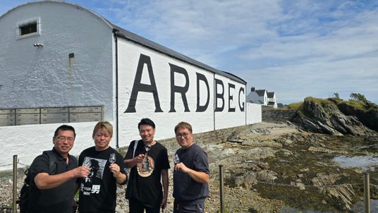 2024年夏、スコットランド・アイラ島にて。株式会社Taiki Cosmic Glen Distillery 経営陣左から:林 憲一郎、堀江 貴文、静谷 和典、三原 一馬
