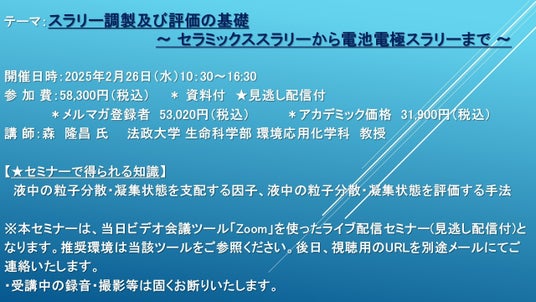 先端技術情報や市場情報を提供している(株)シーエムシー・リサーチ(千代田区神田錦町: https://cmcre.com/ )では、 各種材料・化学品などの市場動向・技術動向のセミナーや書籍発行を行っておりますが、 このたび「スラリー調製及び評価の基礎 ~ セラミックススラリーから電池電極スラリーまで ~」と題するセミナーを、 講師に森 隆昌 氏 (法政大学 生命科学部 環境応用化学科 教授)をお迎えし、2025年2月26日(水)10:30より、 ZOOMを利用したライブ配信(見逃し配信付き)で開催いたします。 受講料は、 一般:58,300円(税込)、 弊社メルマガ会員:53,020円(税込)、 アカデミック価格は31,900円(税込)となっております(資料付)。