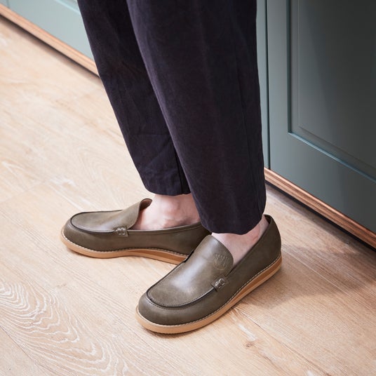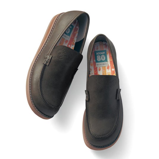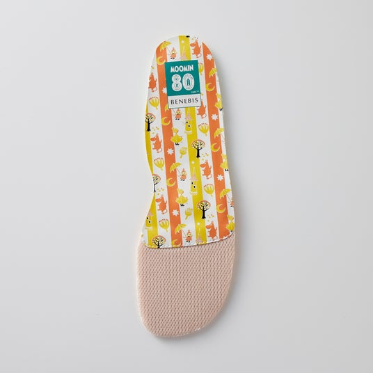 昨年発売し好評だったべネビス※とムーミンとのコラボレーションアイテムに、中敷きに80周年のロゴを施した新色のオリーブグレーが登場しました。柔らかく足あたりのよい人工皮革を使用しているため歩きやすく、春のおでかけに最適なアイテムです。