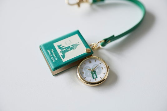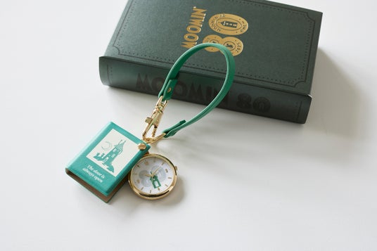 鞄などに取り付けられるベルトと本の形をしたカバーが付いた時計です。カバーをスライドすると時計が出てくる仕様で、バッグチャームとしても使用できます。一冊の小説から誕生したムーミンの物語の周年記念にふさわしい「本」をモチーフに、文字盤にもムーミンをあしらったアイテムです。80周年のロゴを用いた専用パッケージに入れてお届けします。