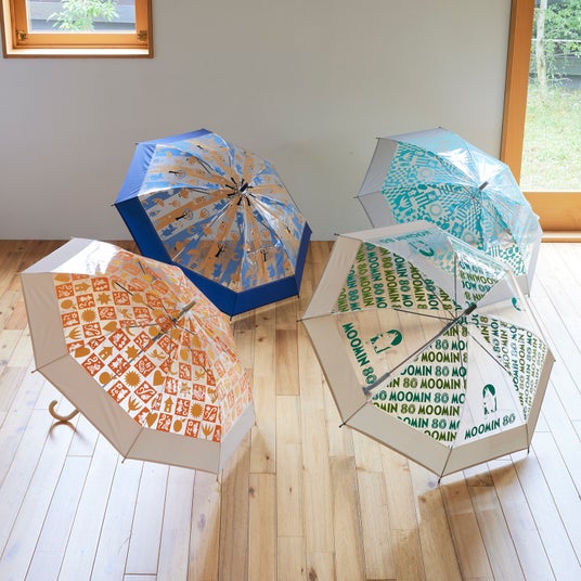 80周年のロゴや特別なアートがカラフルに描かれた4色展開のデザインビニール傘です。「MOOMIN」のロゴモチーフやムーミンのキャラクターなど、雨の日に気分が晴れやかになるような個性豊かなデザインをプリントしました。クリア素材を使用しているので、視界を遮ることなく雨を防ぐことができます。ワンタッチでラクに開くジャンプ式で片手でも扱いやすい仕様です。親骨はグラスファイバー素材を使用しているので軽量で丈夫です。