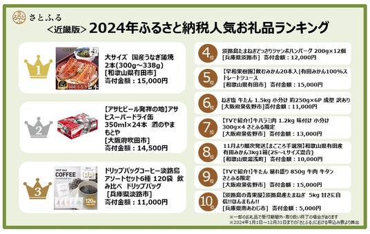 ふるさと納税ポータルサイト「さとふる」を運営する株式会社さとふる(本社:東京都中央区、代表取締役社長 兼 CEO:藤井 宏明)は、「さとふる」における<近畿版>2024年ふるさと納税人気お礼品ランキング(確定)(※)を発表します。