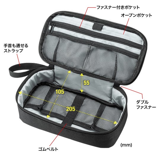 中身がひと目で確認できるメッシュポケットを採用しています。必要な小物をすぐに見つけられるため、取り出しがスムーズです。さらに、ゴム素材で中身の飛び出しを防ぎ、安心して持ち運びができます。また、SDカードやUSBメモリなどの細かいアイテムを安全に収納できるファスナー付きポケットも付属しています。