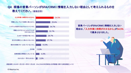 「Q4.現場の営業パーソンがSFA/CRMに情報を入力しない理由として考えられるものを教えてください。(複数回答)」(n=101)と質問したところ、「入力作業に時間がかかるから」が54.5%、「情報入力しづらくて面倒に感じるから」が39.6%、「システムの操作方法がわかりにくいから」が34.7%という回答となりました。