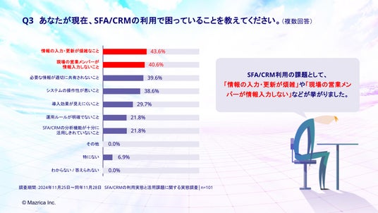 - 01|SFA/CRM利用の課題、「情報の入力・更新が煩雑」(43.6%)や「営業メンバーが情報入力しない」(40.6%)など