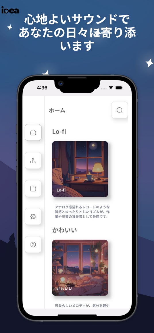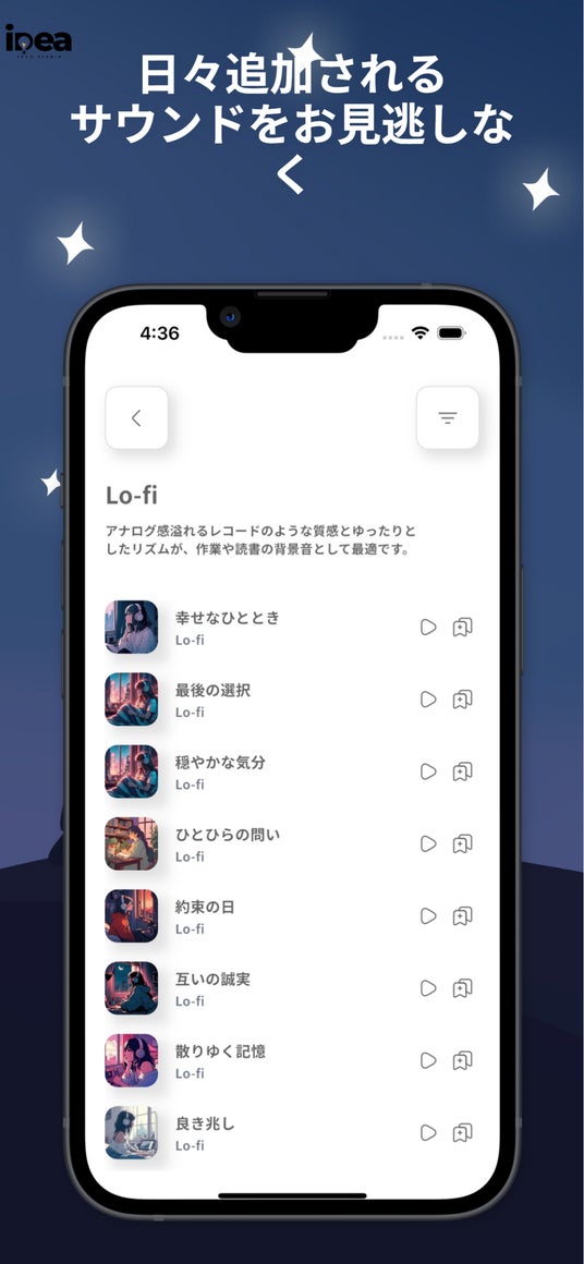 アプリ内のBGMは、独自の審査を通過した高品質なトラックで構成されています。また、新しい楽曲が定期的に追加され、常に新鮮な音楽体験をお楽しみいただけます。