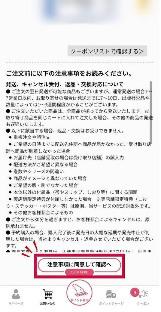 6.利用可能なクーポンを選択後、「注意事項に同意して確認へ」をタップ。