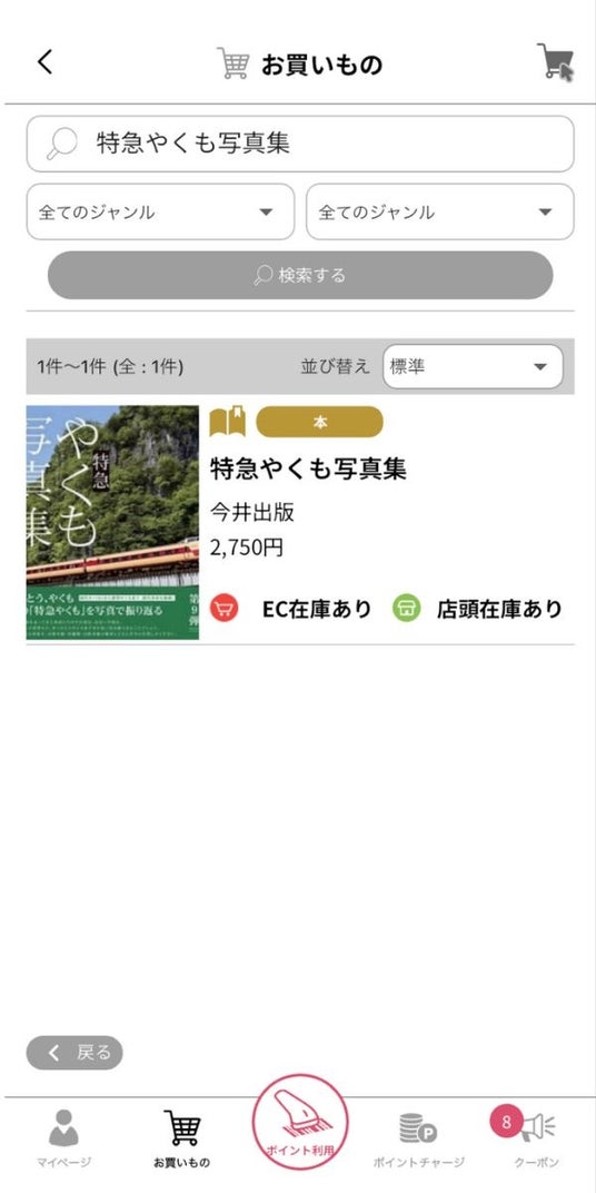 2.検索窓でお求めの本を検索し、ヒットした商品の一覧からお求めの本をタップします。