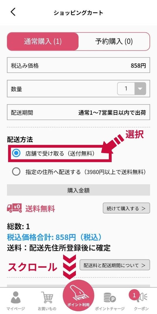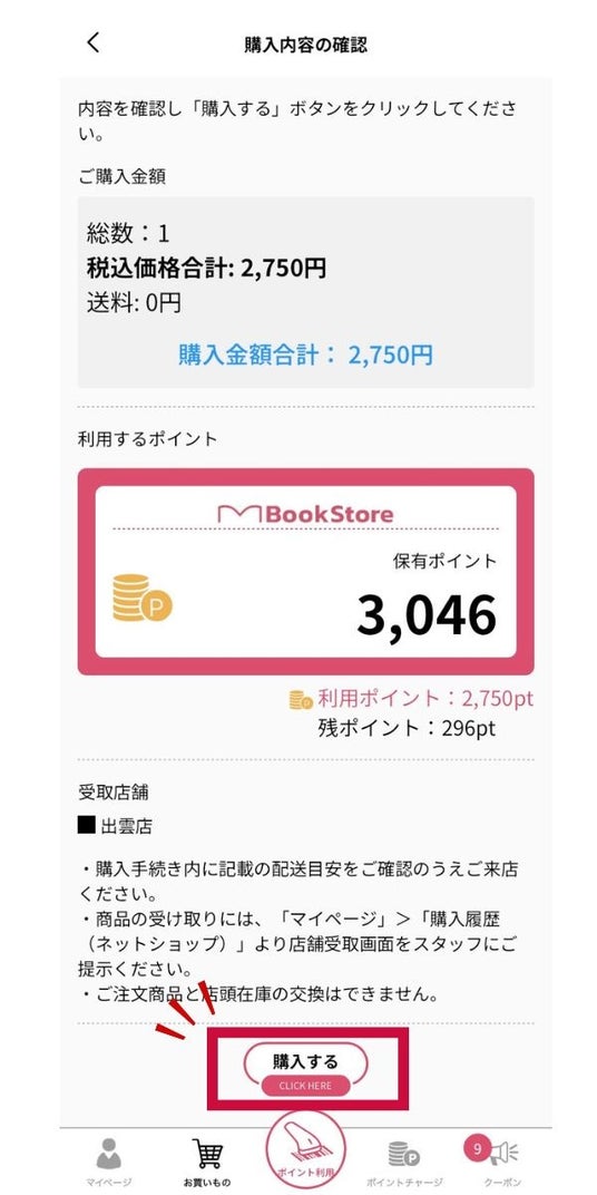 7.購入内容、受取店舗の確認をして「購入する」をタップ。