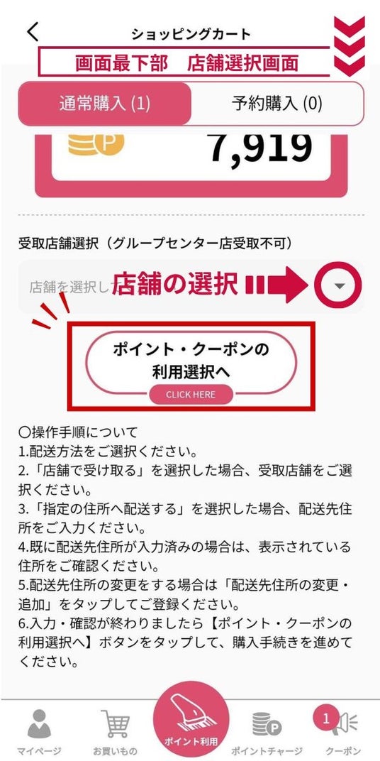 5.ページをスクロールして、「受取店舗選択」にて希望の店舗を選択します。「ポイント・クーポンの利用選択へ」をタップ。