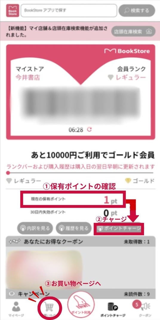 1.BookStoreアプリを開き、ホーム画面の保有ポイントを確認。お買い物ページへ。(※保有ポイントが足りない場合はポイントチャージ)
