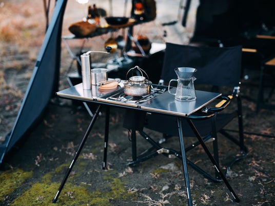 付属のステンレス天板を上部にピッタリと設置することで、サイドテーブルとしての使用も可能です。また、高さを下げることで、食事や作業スペースとしても活躍します。ハイタイプに高さを上げれば、シェルフ台として調理器具や、キャンプギアを置いておくのにも最適です。
