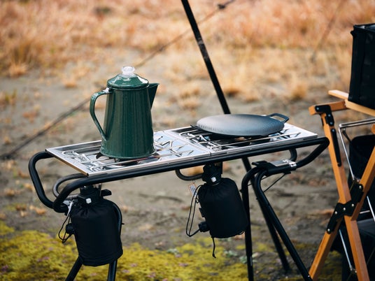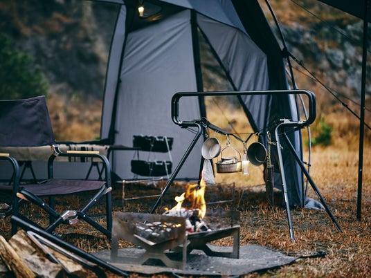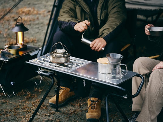 キッチンテーブルとして使用する際は、フレームの角度を開き、付属の2枚のステンレスパネルを併用して、バーナーを設置し、広々とした調理スペースを確保することもできます。フレームの角度を調整してバーナーを2つ設置することも可能です。高さをハイタイプに調整すれば立ったまま調理できたりと、それぞれに合った調理スペースを提供します。