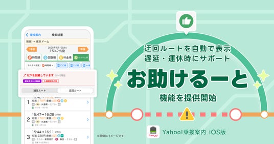 LINEヤフー株式会社(以下、LINEヤフー)が提供する乗換検索アプリ「Yahoo!乗換案内」(iOS版)は本日、有料プラン「Yahoo!乗換案内プラス」(※1)において、検索したルートに、電車の遅延・運休などが発生している場合、自動で迂回ルートが表示される機能「お助けるーと」(以下、本機能)の提供を開始しました。