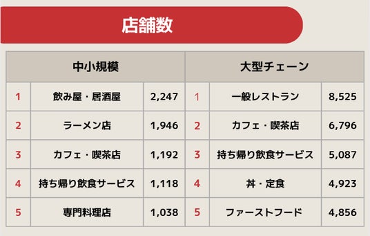 大型の飲食ブランドは全国展開しやすい「ファミレス」や「カフェ」などの業態が上位を占める傾向があります。一方、中小規模のブランドは地域の特性やニーズに合わせた「居酒屋」や「ラーメン」などのジャンルが多くランクインしています。この違いは、ターゲット層や展開戦略の違いによるものと考えられます。