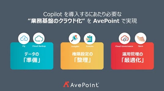 AvePoint Japanは、Microsoft 365 をはじめとしたクラウドサービスのデータ管理を実現する最先端プラットフォームを提供しています。データの移行・バックアップ・管理ソリューションを通してクラウド運用の最適化と安全なコラボレーション環境を実現します。国内においては約220万人以上のクラウドユーザーが、生産性の向上、コンプライアンスの遵守、安全性の確保のために当社の総合的ソリューションを利用しています。