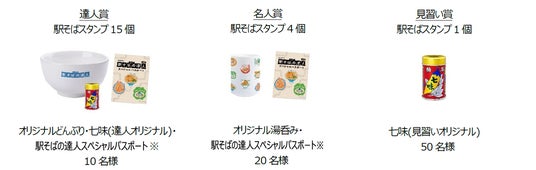 ・取得した「駅そばスタンプ」「ご当地駅そばスタンプ」の数に応じて以下の各賞に応募ができます。