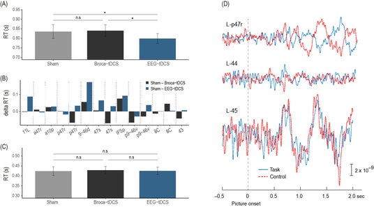 図3 呼称の反応時間(RT)の比較。EEG-tDCS:脳波から推定された領域へのtDCS、Broca-tDCS:ブローカ野へのtDCS、Sham:偽刺激