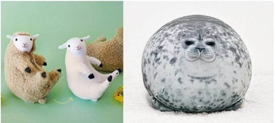 (左)羊の毛刈りぬいぐるみ(右)おまんじゅうアザラシユキちゃん もっちりビッグクッション