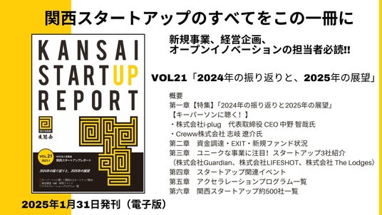 NPO法人生態会(所在地:大阪市北区、理事長:アレン・マイナー)は、「関西スタートアップレポートvol.21」を2025年1月末に発刊します。今年初めての発刊となる21号では、2024年の関西のスタートアップ動向を徹底的に振り返ります。関西だけに特化したスタートアップの資金調達・EXIT・新規ファンド、アクセラレーションプログラムやスタートアップイベントなど、関西のスタートアップ支援に関わる方には必読の情報が満載です。また、関西のスタートアップ支援に携わっている株式会社i-plugの 中野 智哉代表取締役、Creww株式会社 志岐 遼介氏にも取材し、2025年の期待や今後の展望についても紹介します。