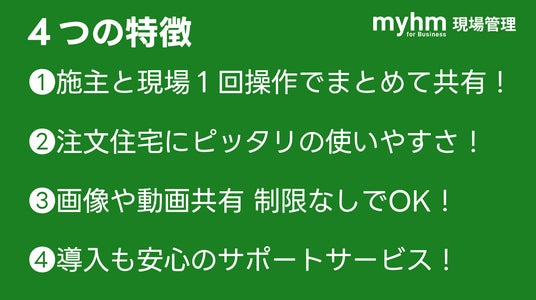 昨今、様々な建築規模に対応すべく、多機能、複雑化された現場管理サービスが増えています。「マイホムビズ現場管理」は住宅の建築現場に特化し、必要とされる機能のみにサービスを絞り、家づくりの現場に最適機な現場管理を提供しています。