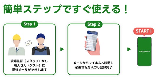 「マイホムビズ現場管理」は招待メールからすぐに使えます。専用アプリをインストールしなくてもスマホで現場管理が使えます。