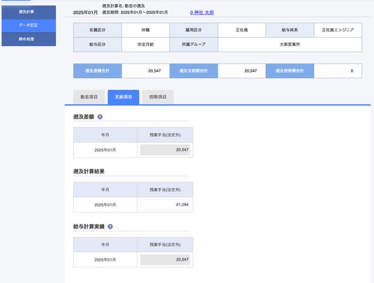 例えば、打刻ミスが原因で勤務時間の計上漏れが発覚した場合において、勤怠データを修正し遡及計算を行うことで、既に支払い済みの給与の差額を計算し精算できるようになります。これにより、遡及計算を行う際の勤怠データの修正をより効率的に行うことができるため、業務工数を削減できます。
