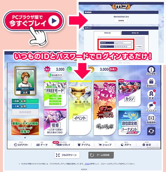 から、いつものIDとパスワードで「PCブラウザ版」にログインするだけで、『MJ』を手軽にプレイできます。