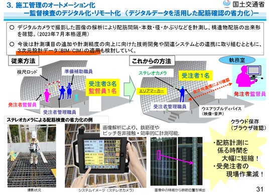 同省は本年4月にこの取組をさらに前進させ、「i-Construction 2.0」を策定。建設現場の生産性の向上のみならず、仕事のあり方そのものを変革し、抜本的な省人化対策を進める必要があることが強調されました。さらに、その実現のため、「デジタルデータを活用した配筋検査」が具体的な取組として位置付けられ、3次元設計データ(BIM/CIM)の適用も検討が開始されることも示されました。