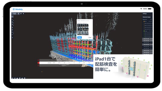 「Modely」は、点群データを活用した3次元配筋検査システムです。LiDAR付きのiPad等でスキャンした鉄筋の点群データをModelyにアップロードし、画面上で検査範囲をクリック指定するだけで、範囲内の鉄筋を自動検出し、モデル化します。この自動生成されたモデルから、鉄筋本数や鉄筋間隔などの検査項目を自動計測し、帳票を自動作成します。さらに、かぶり厚や重ね継手長も計測でき、施工者と発注者間でクラウド上にデータを共有し、遠隔管理も可能にします。