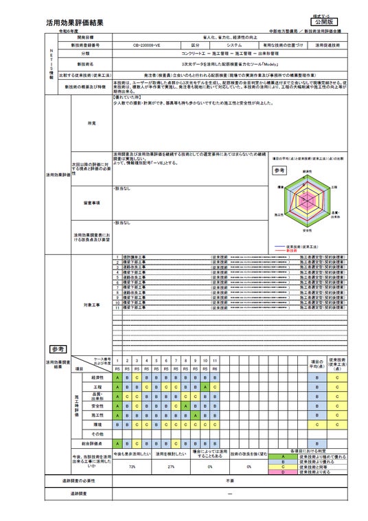 今回、国土交通省の新技術活用評価会議における評価の結果、「Modely」はNETIS-VE技術となりました。今後「Modely」の利用にあたっては、「実施報告書」や「活用効果調査表」の提出が不要となり、手続き負担が軽減されるため、より迅速な導入が可能になります。 評価については、「経済性」「工程」「品質・出来形」「安全性」「施工性」「環境」の項目でそれぞれ評価され、「環境」では「従来技術と同等」、その他の項目では全て「従来技術より優れる」と判定されました。さらに、総合評価でも「従来技術より優れる」という高い評価を得ることができました。また評価者の73%に「今後も活用したい」、27%に「(今後も)活用を検討したい」とご評価いただき、評価者の全ての方々から「今後も活用を続けていきたい」と評価していただくことができました。