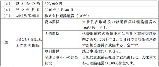 なお、当社代表取締役社長の岩尾俊兵は理論経営の全株式を保有しており、特別利害関係人に該当するため、本件の取締役会審議および決議には参加しておりません。
