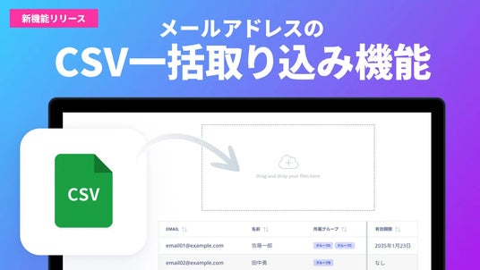 メールアドレスのCSV一括取り込み機能例えば研修運営やマーケティング業務では、新規顧客や受講者を一括で登録し、即座に対象者へ情報配信が可能になります。個別登録の手間を削減し、大規模なキャンペーンやセミナー運営の準備がスムーズに進行します。