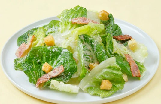 写真右:メニュー例「ベーコンとマッシュルームのシーザーサラダ」(シーザーサラダ オリーブオイル入り使用)