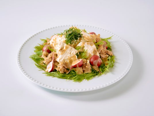 メニュー例:豆腐とツナと水菜のサラダ(胡麻&アーモンド使用)